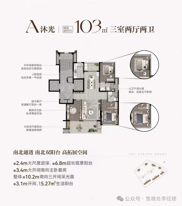 这个户型收纳洗衣便捷高效,设有大开间家政阳台。厨房洗切烹煮一气呵成,公卫干湿分离,互不影响。客厅与餐厅连通,空间开阔。套房式主卧,搭配大进深尺度阳台,拥有宽幕观景视野。南北通透,南北双阳台设计,拓展空间大。南向主卧套房开间 3.4m,还有 2.4m 大尺度进深、6.8m 超长观景阳台,整体 10.2m 南向三开间采光面,阳光满满。
