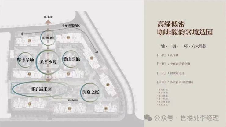 项目在设计上独具匠心,打造了 “一轴・一街・一环・六大场景” 的咖啡馥韵奢境园林。“一轴” 即礼序轴,彰显归家的仪式感;“一街” 为卡布奇诺商业街,充满浪漫风情;“一环” 是健康跑道环,满足业主日常运动需求;“六园” 包含礼仪门庭、柔香水苑、蓝山泳池、摩卡聚场、椰子猫乐园、瑰夏之庭,为业主带来丰富的花园体验空间,营造出高绿低密的舒适居住环境。