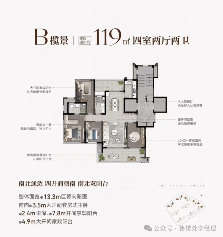 大开间家政阳台满足洗衣晾晒需求。六人位餐厅可让多人从容就餐。四开间朝南,通风采光绝佳。LDKG 一体化空间,让活动区域更宽敞。南北通透,奢享舒适生活。奢阔进深景观阳台,尽情享受阳光。南向 3.5m 大开间套房式主卧,还有 2.4m 进深、7.8m 开间景观阳台以及 4.9m 大开间家政阳台,整体面宽 13.3m 巨幕向阳面,居住体验超棒。
