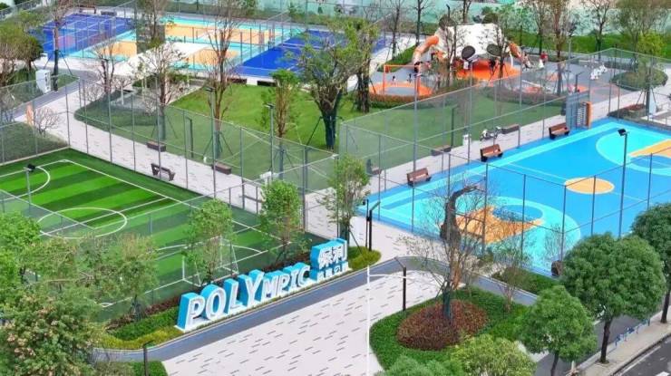 项目周边不仅有东平河、半月岛湿地公园可玩可赏,保利体育公园在项目开放之前已投入使用,兑现进度飞快。公园配置足球场、篮球场、滑板“陆冲”场地,还有佛山首个超800平板式网球场,业态丰盈多彩。