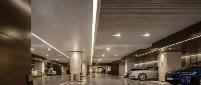 车库色调主要以香槟色为主,通过对行车通道与停车区域的色彩对比处理室内空间关系;