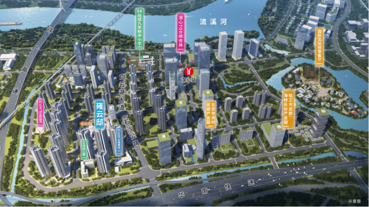 其中可到聚龙站换乘--440亿白云站TOD,这里将规划实现1轻轨+2高铁+7地铁的大型交通枢纽,便捷串联大湾区。