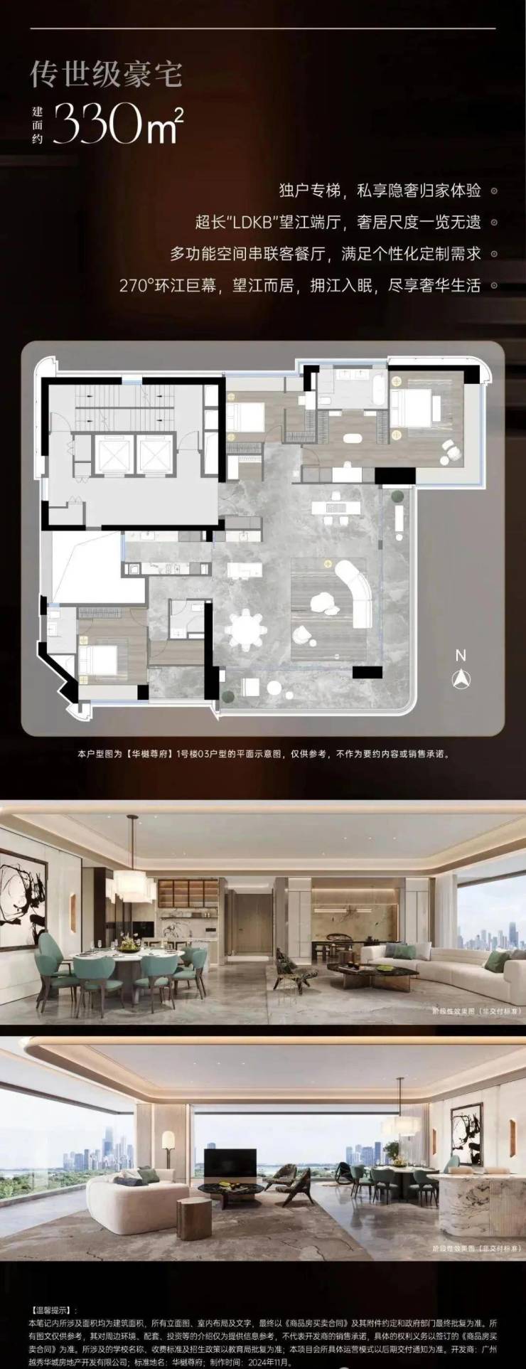 :主推**248-330㎡**四至五房,全系2梯2户/2梯1户布局,东南向采光占比达2/3,部分户型配备270°环幕阳台、L型观景台及6.9米面宽端厅,高层可远眺珠江支流与琶洲CBD天际线