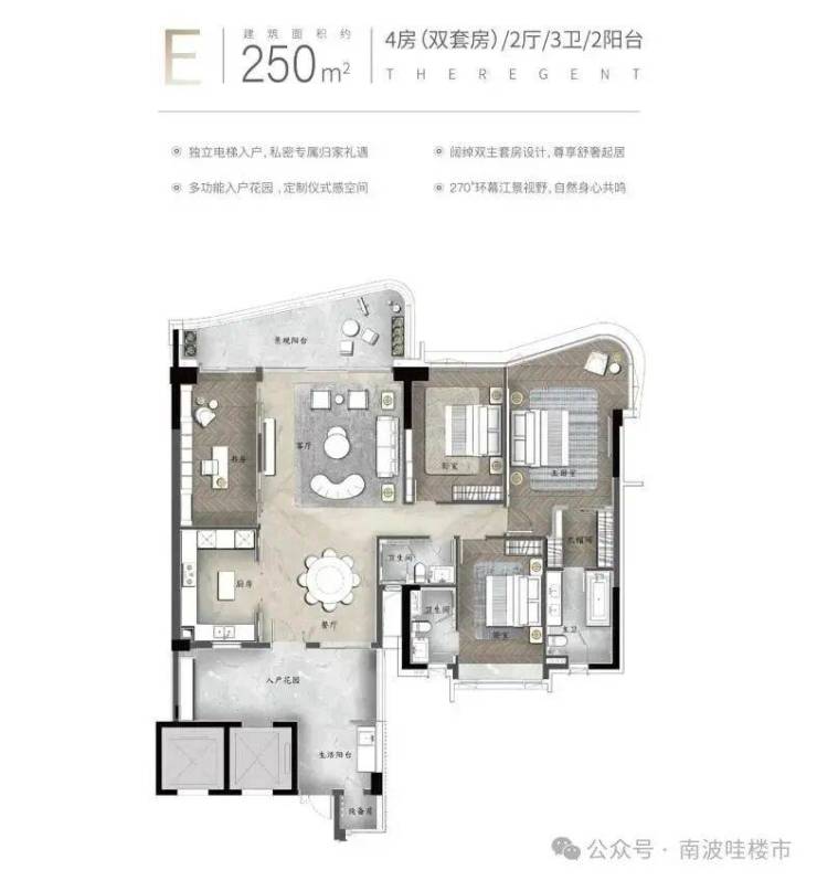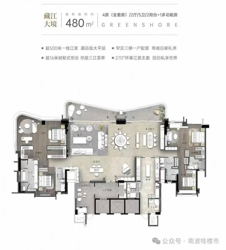 多元化产品线:涵盖140-480㎡江景大平层、叠墅(279-437㎡),其中叠墅实用率高达355%,配备私家电梯、入户花园及超大露台,部分户型首层花园达797㎡。