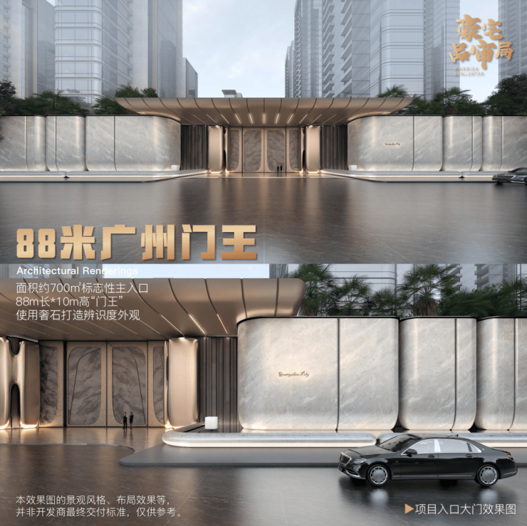 比如在地面归家体系上,保利琶洲南项目规划了一个88米长、约10米高的主大门,巨大的体量感堪称广州“门王”,它也是整个400米超级界面的视觉中心。