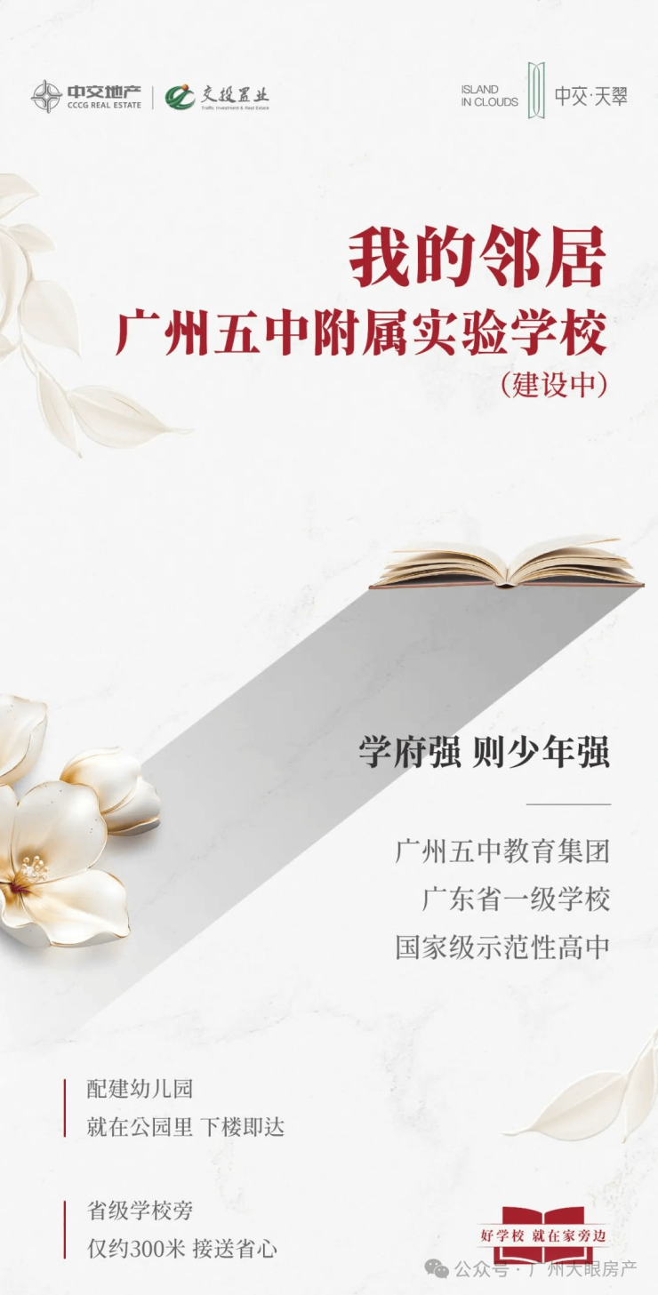 项目会配建一所9班幼儿园,现在中交天翠官宣,可就近入读广州五中附属实验学校(建设中)。