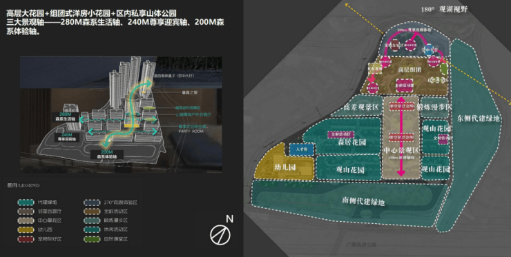 越秀地产的天字系顶级系列作品,园林设计融入湖山观景体验,延续约20米高差脉络打造一廊三轴高差式园林;项目打造100%纯南向低密墅区:南北对流 ,通风采光俱佳,无遮挡一线园林景观。