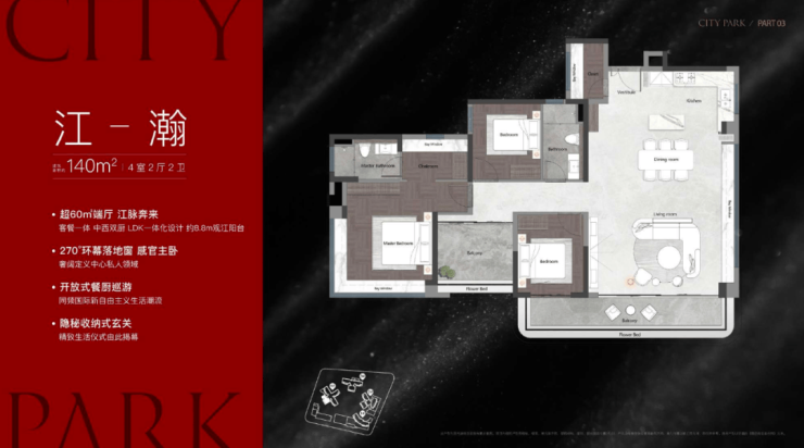 作为整个盘的入门款,120平“珠晖”户型相当于缩小版的鎏光户型,集合了市面上大部分最先进户型的设计细节。