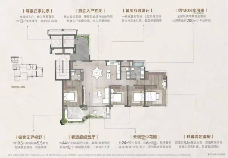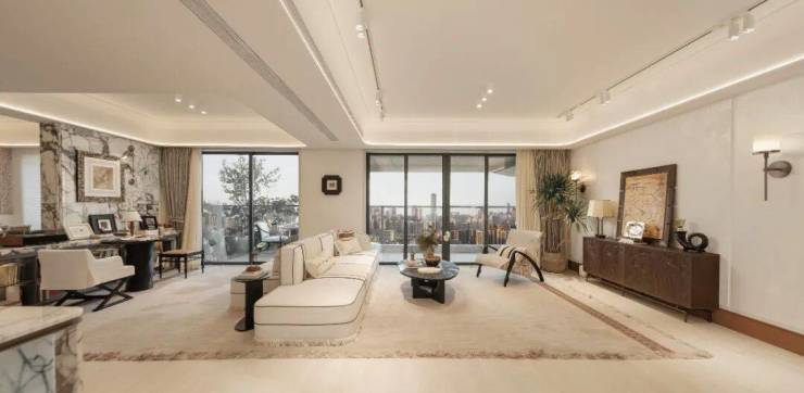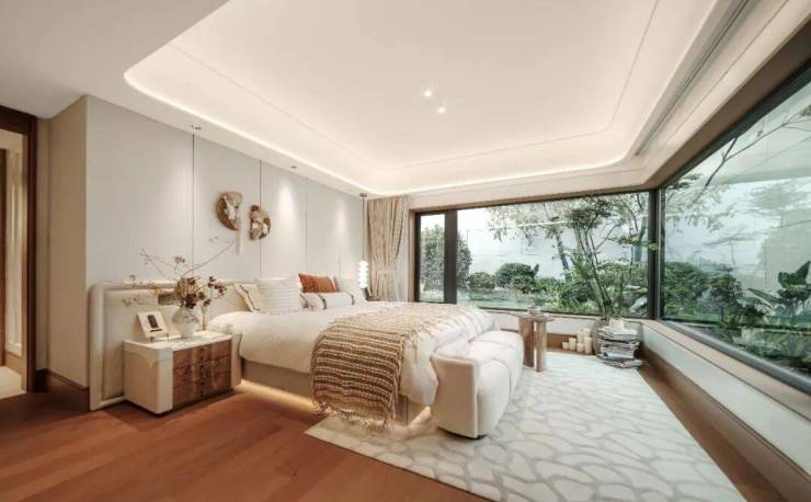 以约44㎡无界宽厅划写天际线,约19.5米环幕视界打破空间桎梏。奢适主卧套间三面环景,270°环幕飘窗私藏四时光影,以建面约139㎡空间容器承载约200㎡奢居想象。