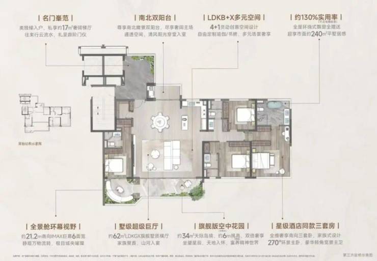 约62㎡墅级横厅铺陈约21.2米南向采光面,约130%极致实用率(不含电梯前室)重构约240㎡生活版图。约6米错层挑高空中会客厅悬浮于云端,于自然诗意中,启幕塔尖人生。