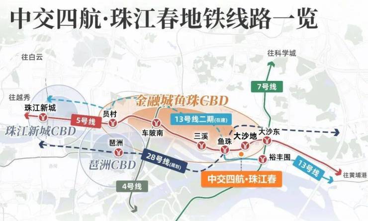 项目毗邻的鱼珠站、大沙地站双地铁站,目前就能通过地铁5号线直达金融城、珠江新城,实现丝滑通勤,未来13号线二期开通后,也通过鱼珠站直抵珠江新城。
