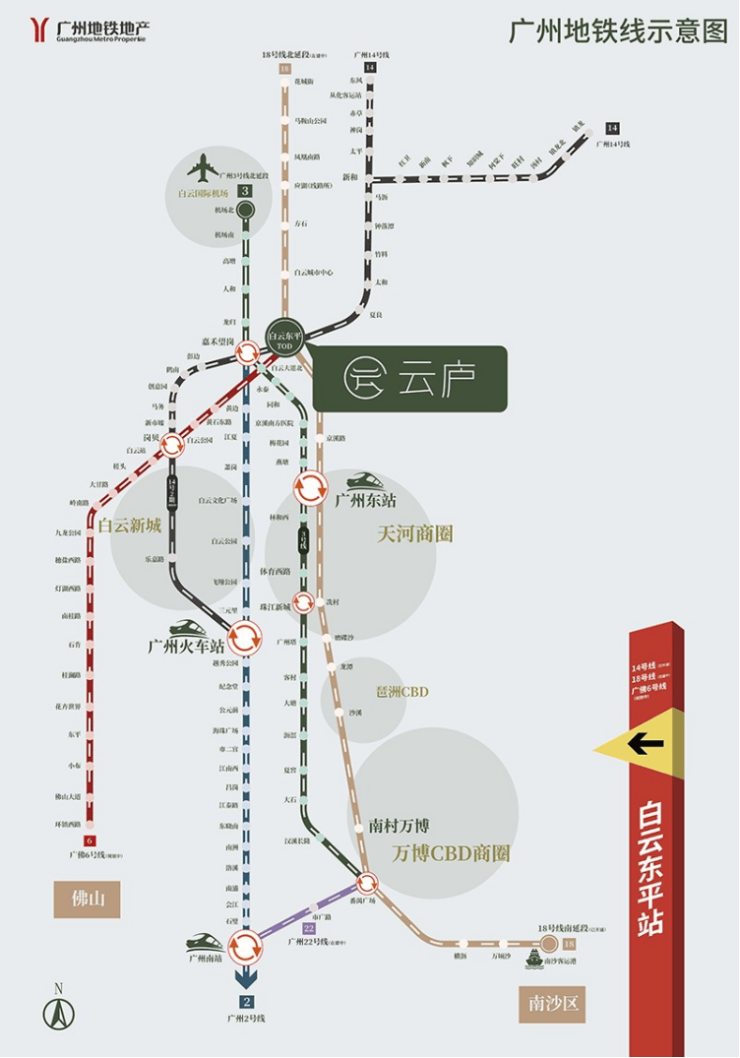 作为广州地铁地产打造的TOD项目,云庐的交通优势显著。项目与广州地铁14号线白云东平站无缝衔接,通过换乘可快速抵达珠江新城、琶洲等核心商务区。