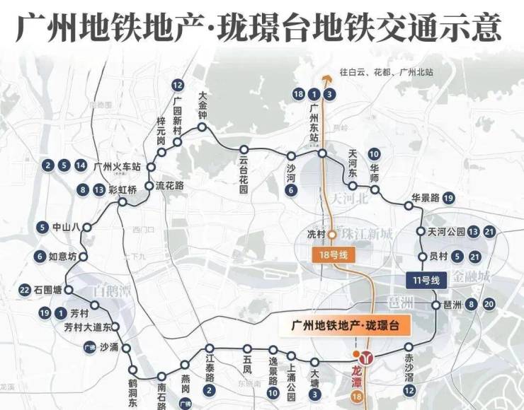 ✔️ 交通枢纽地位突出,双地铁上盖:项目最大亮点是真正的双地铁上盖(距龙潭站B出口约132米)。18号线为高速地铁,1站可达琶洲,2站直达珠江新城;11号线(在建)为广州首条环线,开通后将极大提升通往中心各区的便利性。此外,周边有“四纵三横”主干道网络,自驾出行也十分便捷。