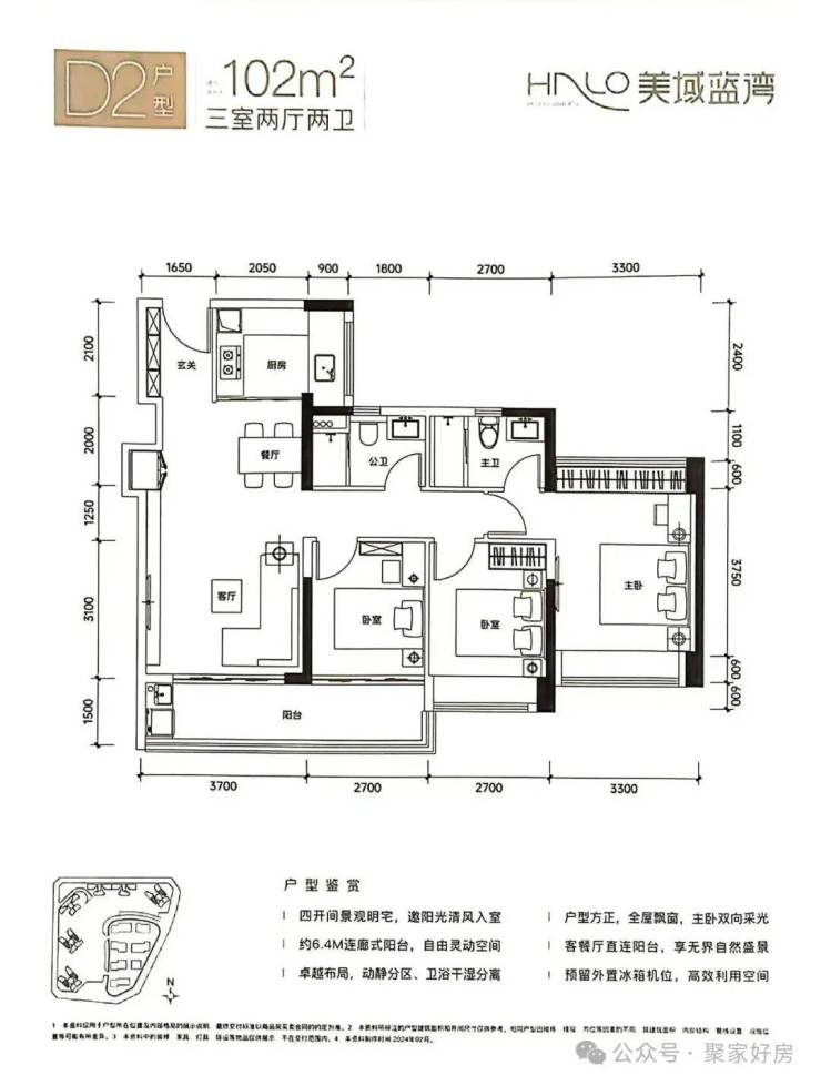 D2户型-102㎡的3房2厅2卫,设计的是竖厅格局,客厅连接卧室出阳台(有6.4米长),四开间朝南,S墙设计预留冰箱位,主卧双飘窗南北对流,U型厨房,得房率:80.11%(不含赠送),有东北向或西南朝向。