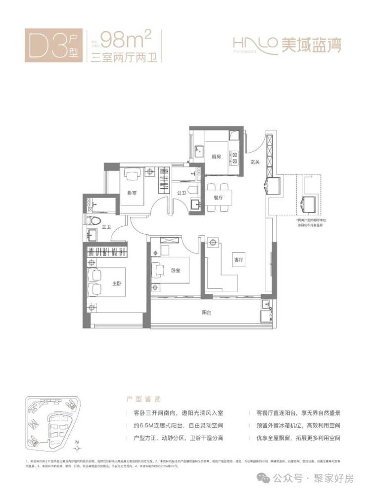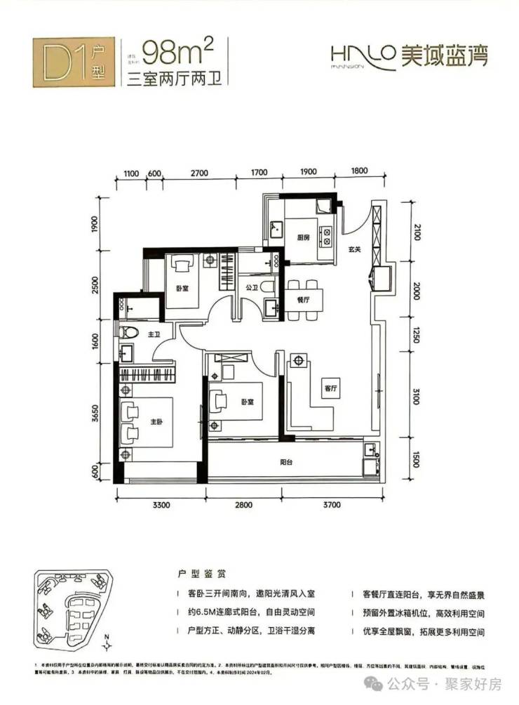 D1户型-98㎡的3房2厅2卫,设计的是竖厅格局,客厅连接次卧出阳台(有6.5米长),三开间朝南,S墙设计预留冰箱位,U型厨房,得房率:80.12%(不含赠送),有西南向或东北朝向。
