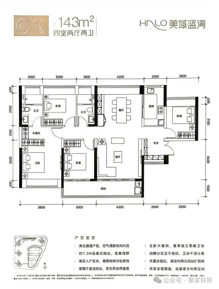 144㎡的4房2厅2卫,设计有2个户型,1个是类似于双龙抱珠的格局,正南朝向,1个是南北通透格局,得房率:77.03-77.13%(不含赠送),位于楼王单位,俯视小区全景。