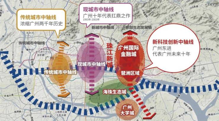 · 2013年后天河CBD核心东移,广州第三中轴线诞生。由国际金融城、广州科学城、广州大学城、琶洲电商总部串联成一条新的“城市纵贯线”承接东进、南拓的使命,代表了广州未来十年城市雄力。