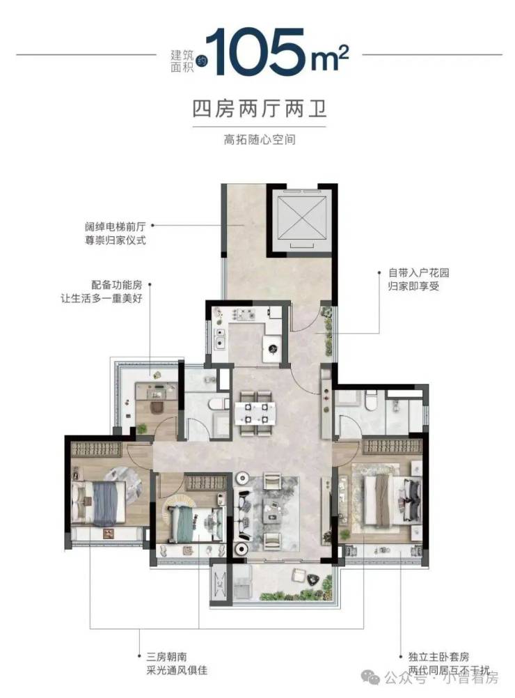 106㎡四房:四开间朝南,自带入户花园,主卧独立套房设计。