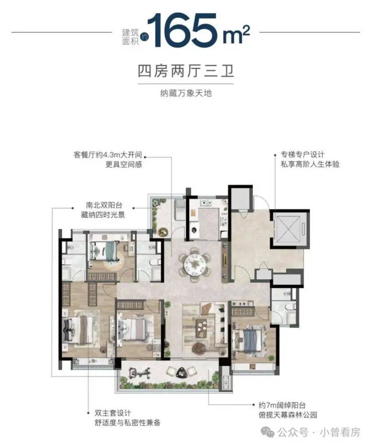 168㎡四房三卫:双主卧套房、南北双阳台,7米超大阳台尽揽园林,真正的高阶改善户型。