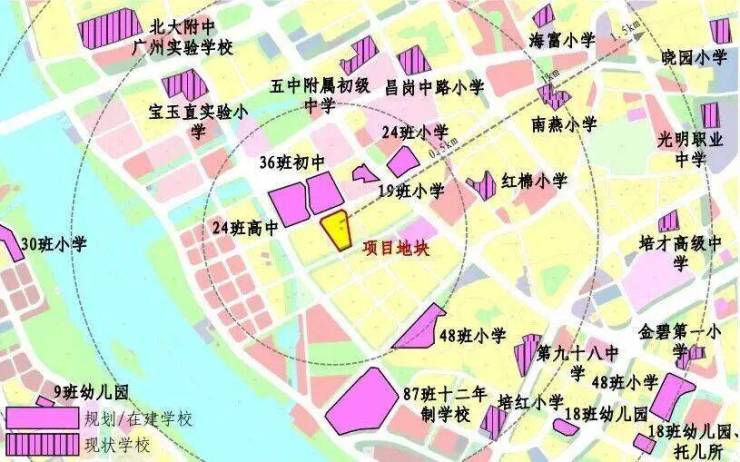 项目自身没有配建学校,但周边名校环伺,3km直线范围内包含广州市五中附属初级中学(省级)、广州市第41中学(省级)、宝玉直实验小学(光大校区)、江南外国语学校、工业大道中小学、红棉小学、海富小学、南燕小学、培红小学等9所学校环伺,拥有完善的区域教育体系。
