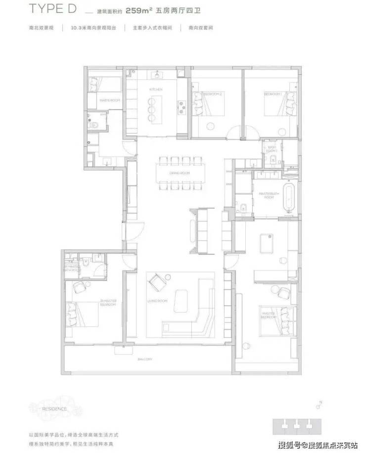 提供多种户型选择,包括 145㎡三房两卫、174㎡四房两厅三卫、190㎡五房两厅三卫、315㎡等户型。所有户型均采用高品质材料和工艺设计,有 7m 森幕宽厅、270° 景观阳台等设计,注重景观视野与空间布局。