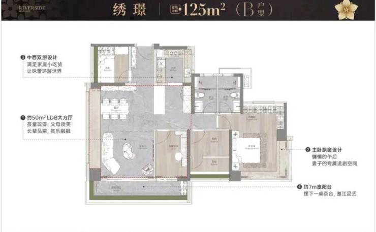 LDKG一体化公区(客厅、餐厅、厨房、阳台)打造出大气社交空间,多个独立套房设计则让居住体验向星级酒店看齐。
