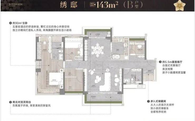 最大的是建面约180㎡的五室两厅三卫户型,不仅有南向江景视野,还配备了270°转角飘窗