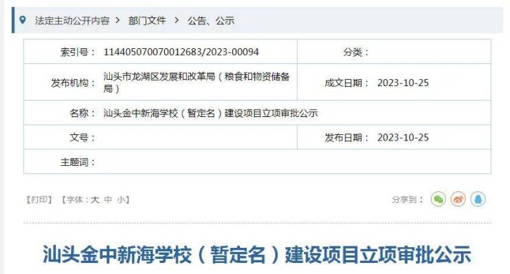 关于天汇旁金中新海学校:10月25日,汕头市龙湖区发展和改革局发布汕头金中新海学校(暂定名)建设项目立项审批公示。汕头金中新海学校(暂定名)建设项目,位于广东省汕头市龙湖区中阳大道与友谊路交界东南侧。建设期限2023年12月至2025年11月,总投资49177.72万元,资金来源由上级财政资金统筹解决。