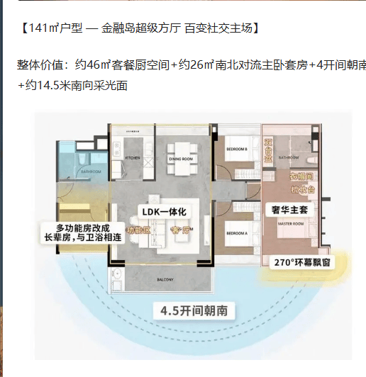 核心亮点:约 26㎡南北对流主卧套房,配备独立衣帽间与卫浴;金融岛唯一阳光玄关,进深 1.8 米,可设置鞋柜与展示区;4.5 开间朝南,采光面达 12.6 米。
