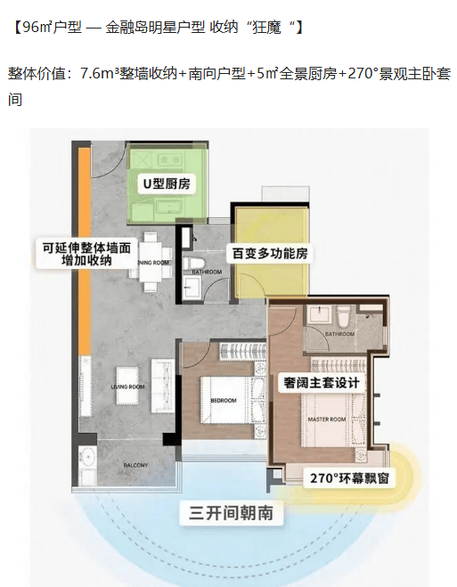 核心亮点:7.6m³ 整墙收纳系统,相当于多出 2 个标准衣柜空间;5㎡全景厨房,操作台面长度达 3.8 米;270° 景观主卧套间,可俯瞰河涌景致。