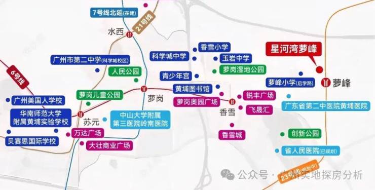 项目周边教育资源丰富,有幼儿园、托儿所和半山小学(54班),北侧是广州苏元学校东校区(90班),已纳入广州二中教育集团,将于2024年9月开学。项目符合政策的小学毕业生可对口直升苏元二中,今年开设初一和初二共13个班。
