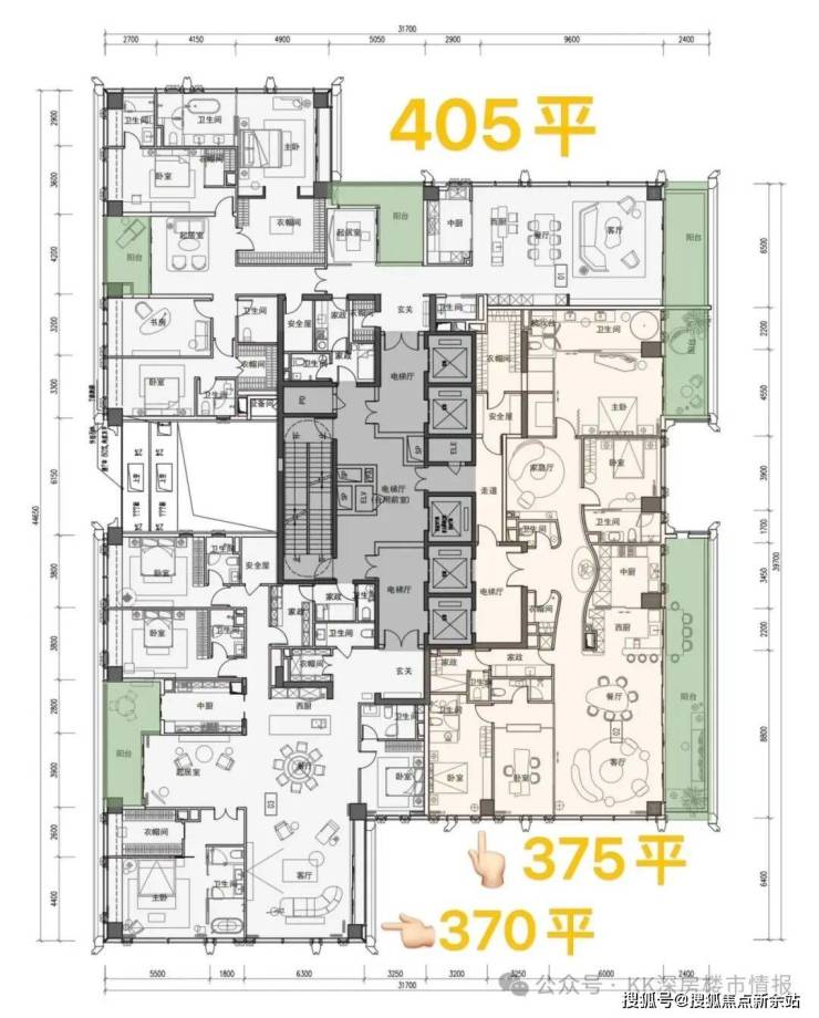 ②高区42F起(150-200米)是约370-375-403㎡4+1房五卫+家庭厅+家政套间;