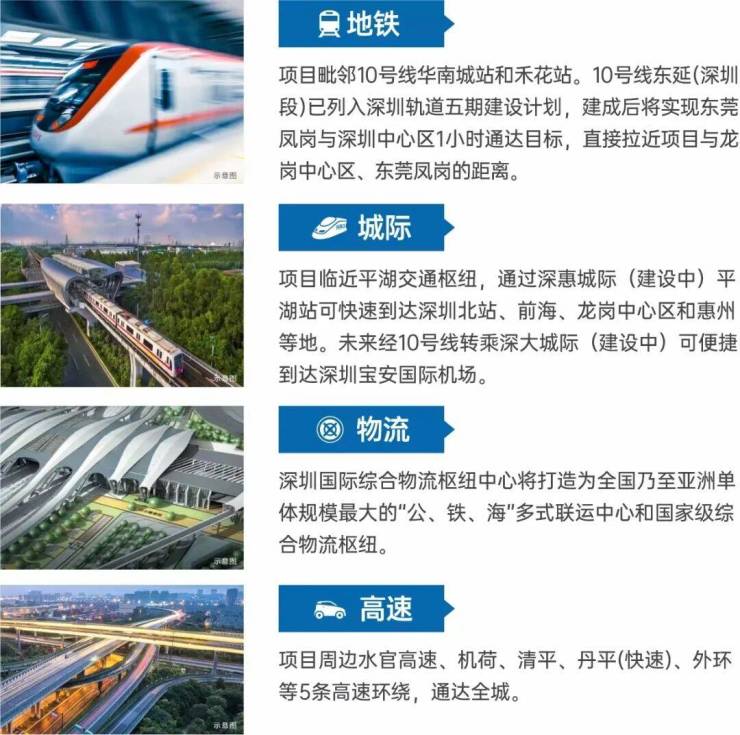 项目坐落于龙岗区平湖街道禾花社区,邻近地铁10号线华南城站和禾花站。项目同时毗邻华南城,近享中欧班列始发站深圳国际物流枢纽中心。