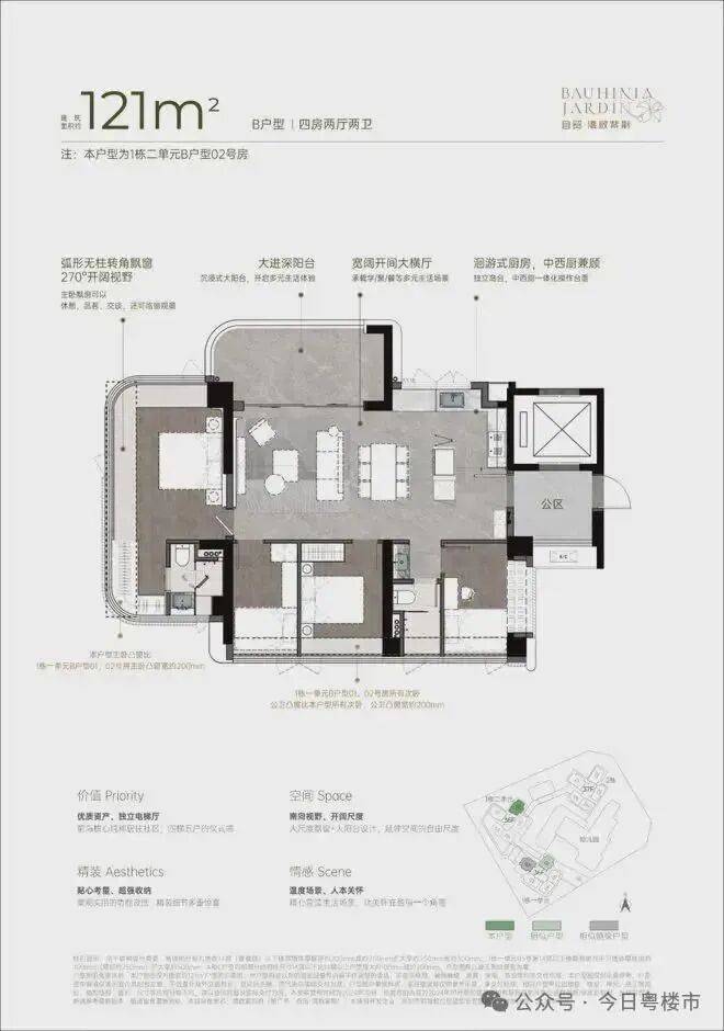 • 270°弧形无柱大尺度飘窗、大宽厅、大阳台,带来更多使用空间。