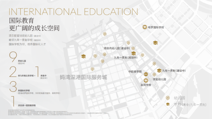 项目周边拥有15所幼儿园、4所义务教育学校,还有荔湾小学和深大附中等学校都在周边。此外项目靠近多所国际学校,拥有3000到5000个名额,包括荟同国际学校、礼德国际学校、英国国王学校(深圳分校)以及深圳哈罗国际学校。临近小区南侧有一块九年制教育用地,但目前未招标。入住早期可能要到妈湾南二外学校或者前湾南二外学校上学。