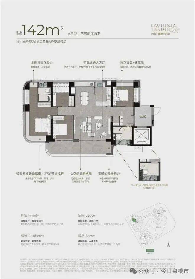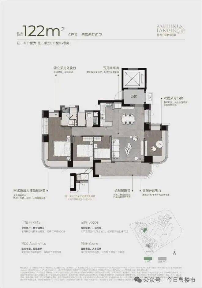 双龙抱珠户型,整个户型非常通透。书房分布于客厅另一侧,难得的双面采光+270°景观视野。主卧南北通透,景观面开阔。