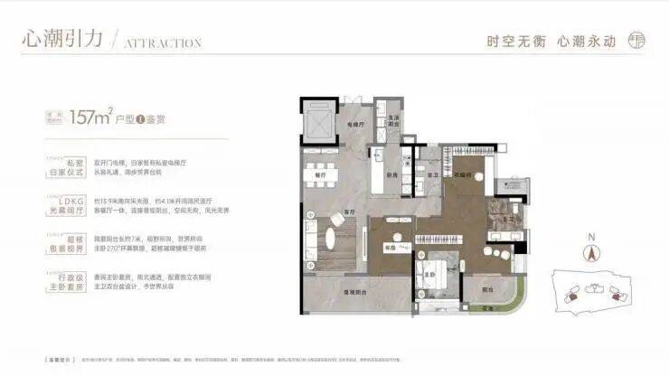 项目占地面积 11000m²,建筑面积 38000m²,容积率 3.4,绿化率 35%,车位数 306,车位比 1:2.1 。仅有 3 栋楼,层高 20 - 26 层,总户数 166 户,产品为 157 - 257 平大平层,客群纯粹,专为追求高品质生活的人士量身定制。