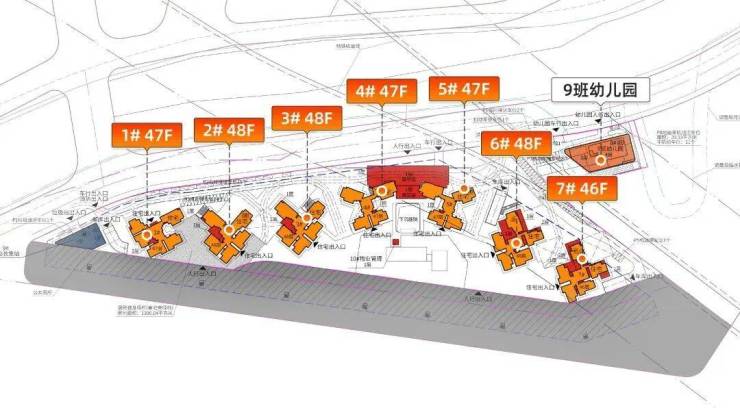 - 建筑形态:7栋46-48层超高层一字排开,外立面采用玻璃幕墙+合金材质,突出现代感与地标属性。