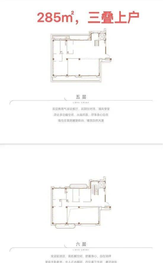 ②三叠的上叠面积为285㎡,首层花园面积区间约为27-90㎡,天台面积约为108㎡实用率达到178-274%;
