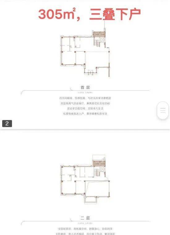 下叠面积为305㎡,首首层花园面积区间约为233-517㎡,实用率238-355%;三叠户型最高可做到6房。