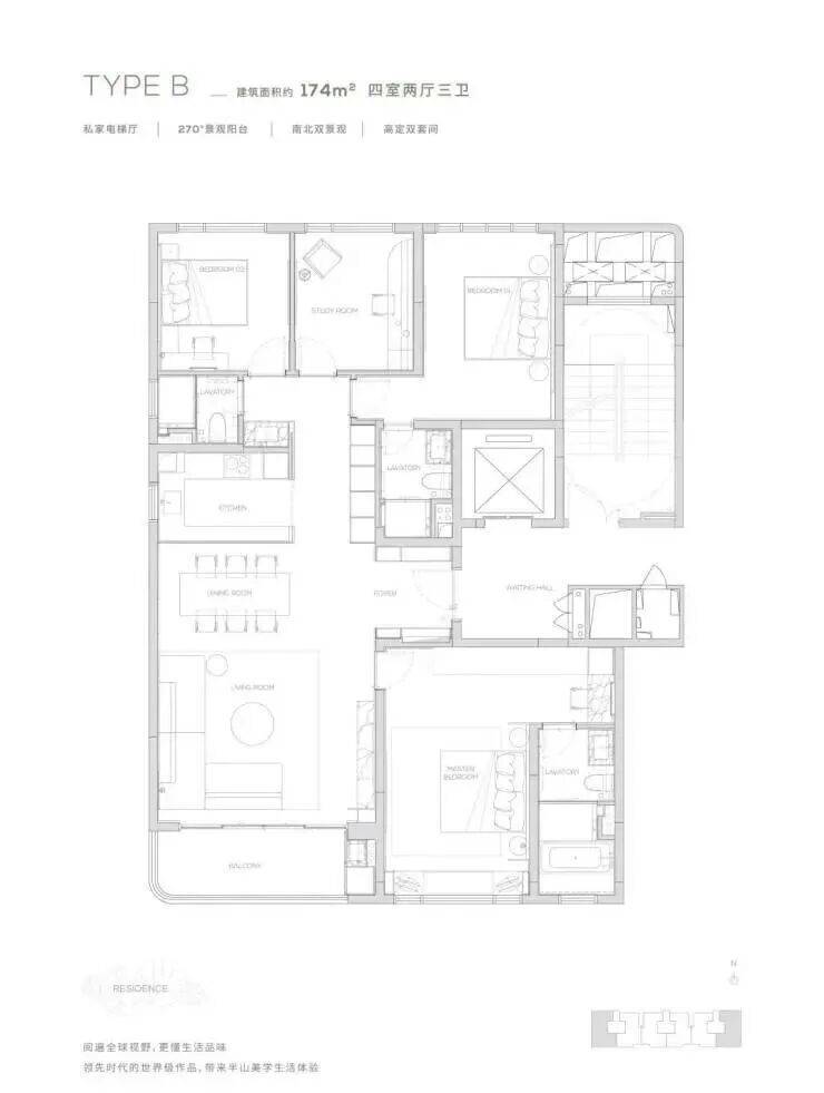 174㎡四房:270°环幕观景阳台,高定双套间,边厅布局大气开阔;