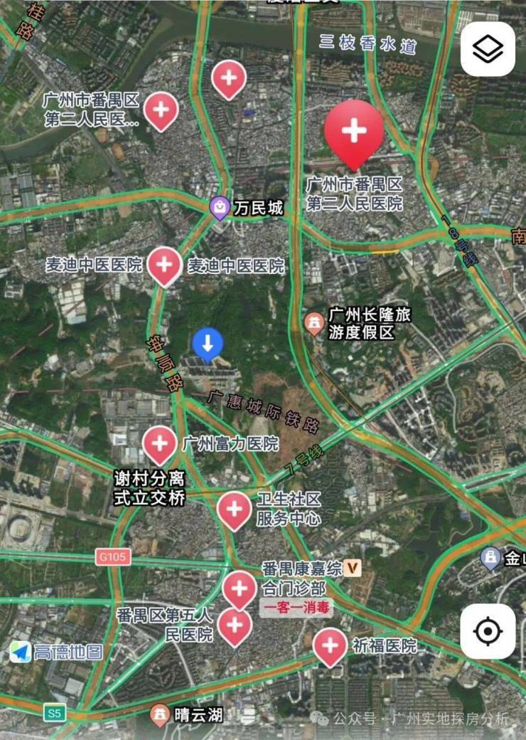 周边有番禺区第二人民医院、富力UCLA国际医院等。