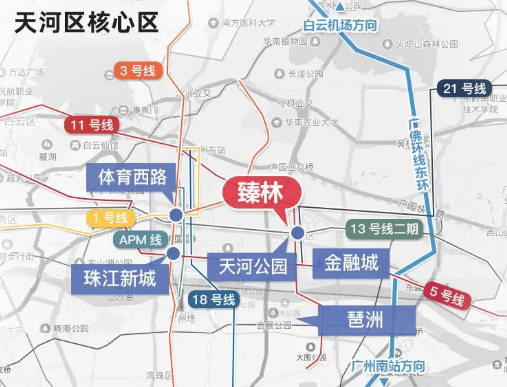 生活配套交通方面,临近亚洲最大地铁站 —— 天河公园站,21 号线、13 号线、11 号线三地铁交汇。21 号线串联多个产业组团,13 号线贯通东西,11 号线是主城区环线。教育上,周边有华港幼儿园等公立幼儿园,小学对口华融小学,中学对口广州市第一一三中学(金融城校区)。医疗上,小区北面 800 米是东晖社区卫生服务站,1200 米处是南方医科大学附属第三医院。