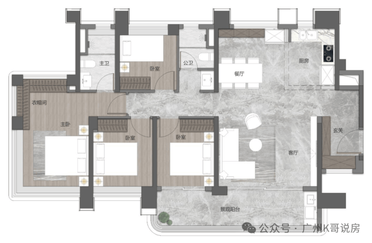 先来看95㎡的户型,南向三房设计,客餐厅和阳台开间去到5.6米,也可改四房,主卧套房设计,带270°大飘窗。
