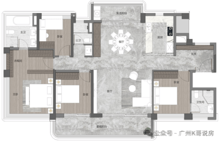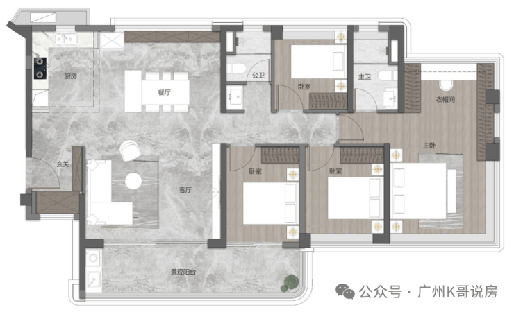 138㎡四房户型,做到了四开间朝南,约16.6米大面宽,而且餐厅带飘窗,做到了南北对流,主卧还配置了独立衣帽间和超大收纳柜,很适合二胎家庭居住。