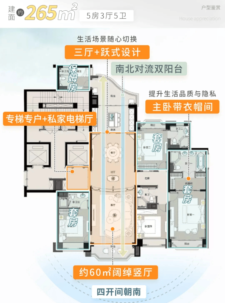 此外,项目在户型设计上进行了大胆的创新与突破。目前在售产品涵盖130平方米至265平方米的三至五房户型,满足了从刚改到终极改善的不同需求。特别是大面宽、短进深的户型设计,使得室内空间利用率大幅提升。层高方面,项目普遍采用3.3米至3.5米的奢阔层高,这一数据远超市面上常见的2.8米或2.9米层高,极大地提升了室内的空间感和舒适度,让居住者能够享受到豪宅般的尊崇体验。