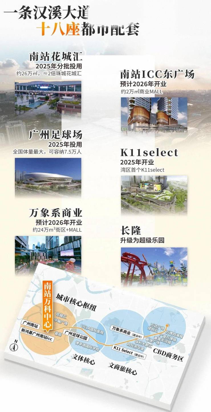 南站ICC、花城汇、喜街、K11select、万象系,密如蛛网的地标商业,带来世界级地标商圈配置,出门就是逛不完的高端商业。 从南站到足球场,再到长隆万博,一站式的枢纽、文体文旅、商圈等资源紧密咬合,自由流动。