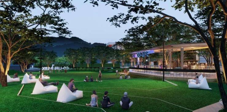 活力阳光草坪:参考日本星野OMO7酒店的设计灵感,打造约1300㎡社交草坪,形成独具特色的坐阶模块,可坐可躺,享受松弛氛围