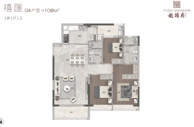 建面约108㎡同样适合一家三口,三代同堂也可以考虑。