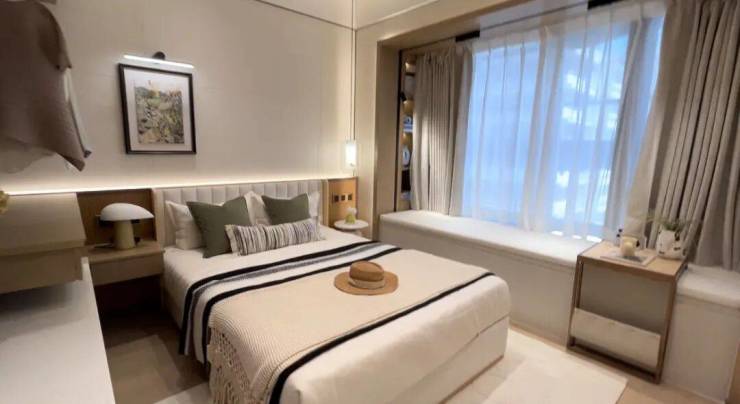 主卧大面积采光,可以参考板房布局,在床边安置一些置物柜和化妆区。